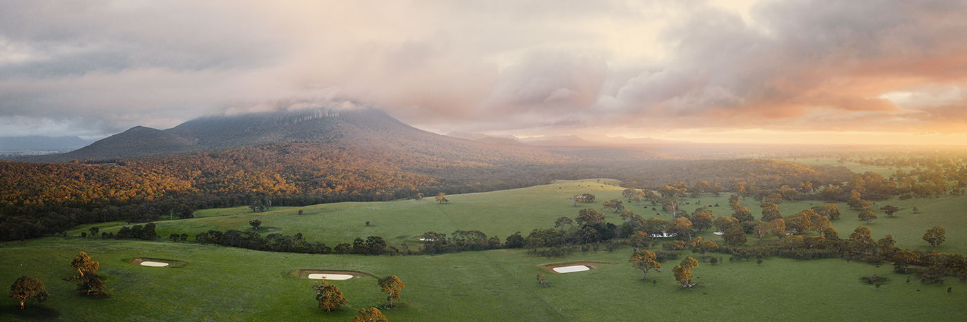 At sunrise in Dunkeld, the view north is breath-taking. Mount Abrupts peak is wrapped in a soft patch of cloud that catches the early light and glows a deep red. Beyond it, the rest of the northern Grampians stretch into the distance, their ridgelines slowly brightening as the sun climbs higher.