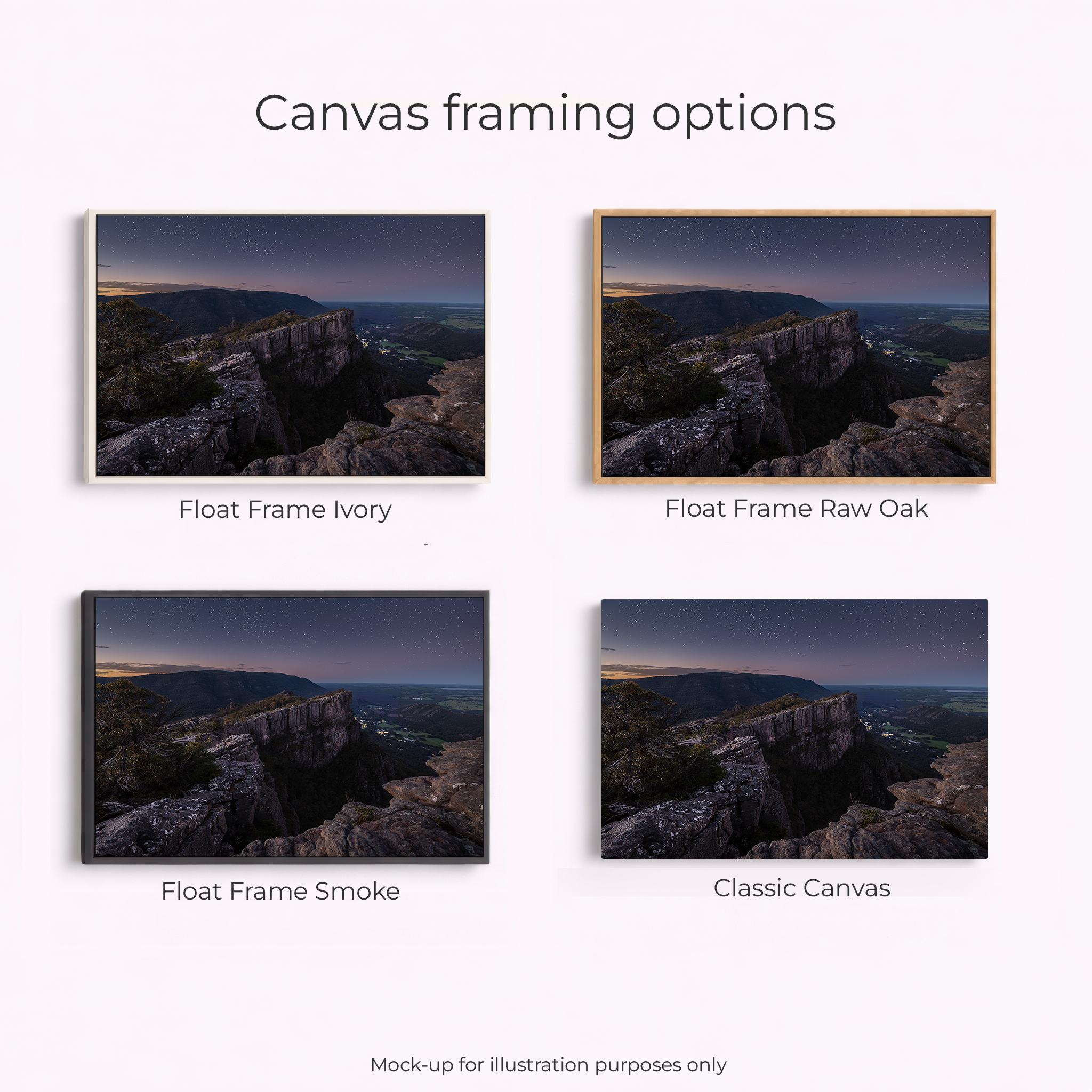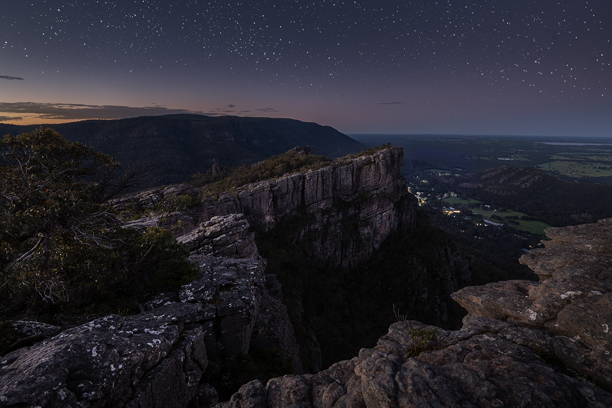 Twilight at the Pinnacle feels like the Grampians in two worlds at once — the last orange glow of sunset hanging on the horizon while the first stars quietly appear overhead. The cliffs fade into soft blue shadow, and far below, the lights of Halls Gap start to shimmer through the dusk. A perfect, peaceful moment between day and night.