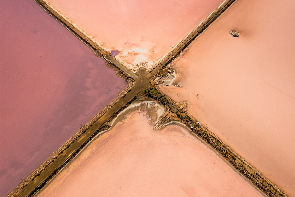 What makes Lake Bumbunga so addictive for abstract aerial photography is the natural geometry. As the lake shallows, dries, and refills, it creates clean blocks of colour, sharp edges, and marbled textures—like a giant, living canvas. From the air, you get these minimal, graphic compositions: pink plates, white salt crust, dark seams, and long straight lines where the landscape and salt fields meet.