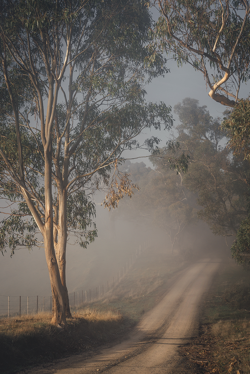 A quiet hilltop dirt road in the Murrindindi Shire, surrounded by rolling hills and early-morning stillness. The sun rises over a blanket of thick fog, softening the landscape and lighting the countryside in warm gold. You don’t have to stray far from Melbourne to get amazing rural views.