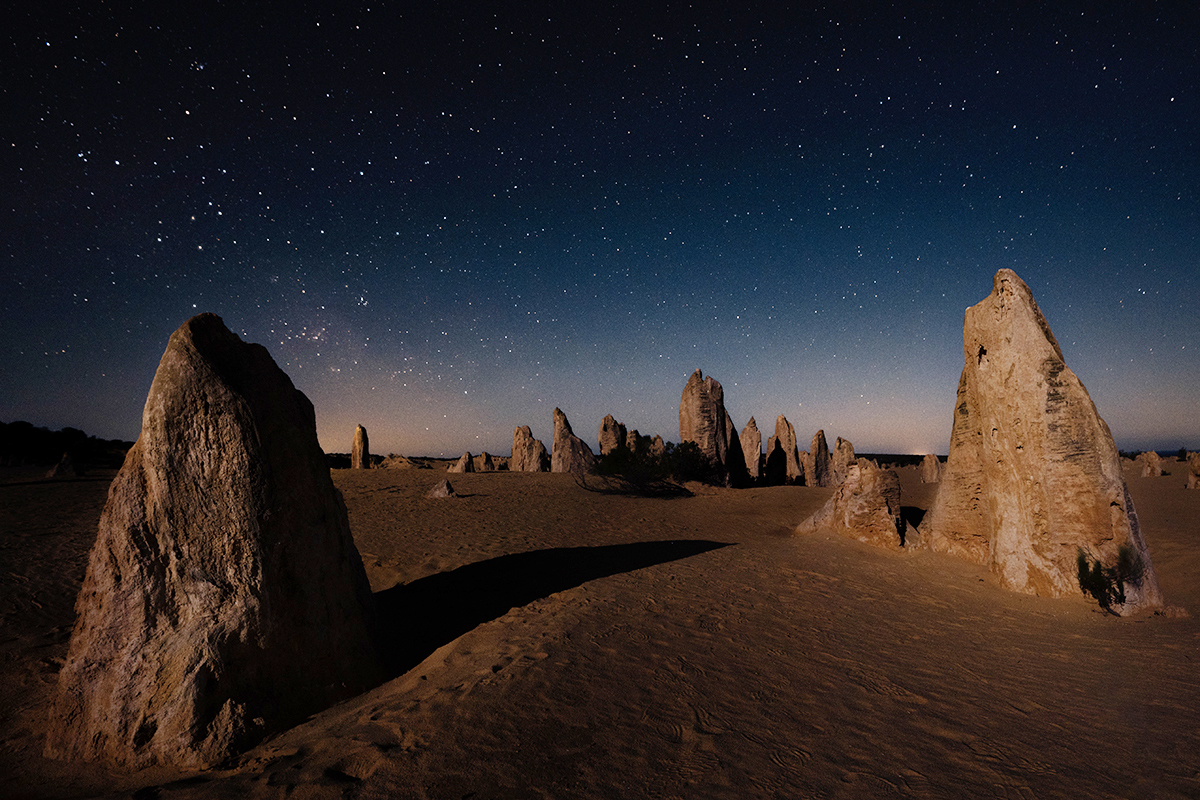 One of the most unreal stargazing spots near Perth! The bright moon cast long shadows off the Pinnacles. The Pinnacles Desert is a surreal field of thousands of limestone spires rising out of yellow sand in Nambung National Park. Its located about 2.5 hours north of Perth near the town of Cervantes. Some pinnacles stand up to around 3.5 metres tall, shaped over time as the surrounding sand and softer material eroded away. There is an endless field of compositions to wander through.
