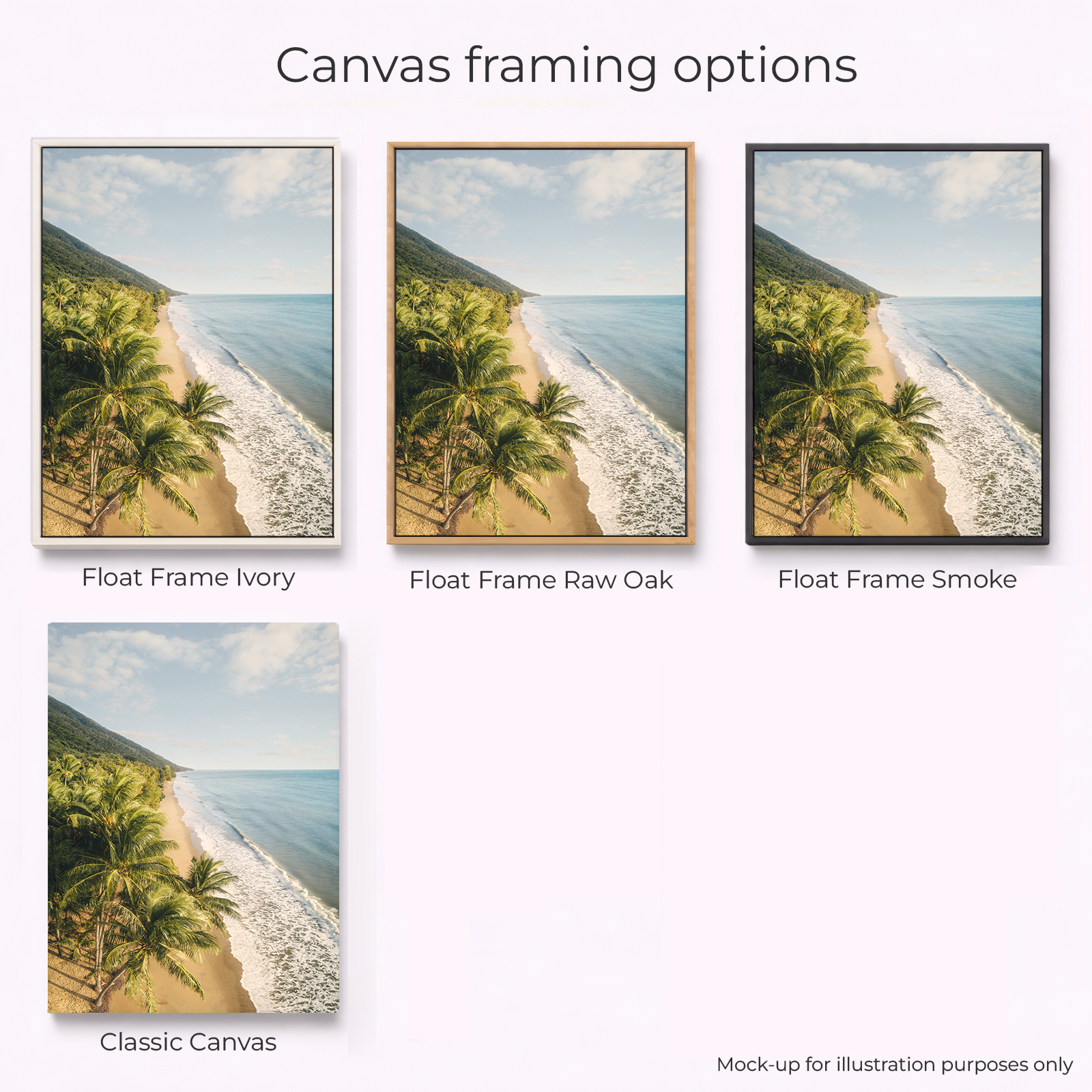 This print captures Ellis Beach, where rainforest meets the Coral Sea just north of Cairns. A long stretch of golden sand curves along the coast, lined with postcard-perfect palm trees that frame the shoreline. Forested hills rise behind the beach, pointing toward the horizon. Ellis Beach is a more untouched alternative to its neighbour Palm Cove which is a bustling tourist hub. Less crowds and shops. Just a picturesque classic Far North Queensland coastline.