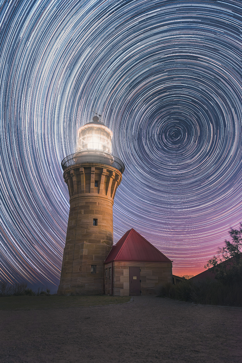 Star trails are what happens when you point your camera at the night sky for long enough that the Earth’s rotation becomes visible. Instead of stars looking like pin-pricks, they smear into arcs or circles across the frame. Aim near the South Celestial Pole (in Australia, roughly above the southern horizon) and they’ll look more like rings around a pivot point. This shot was a result of 4 hours of continuous shooting. The foreground exposure was taken during twilight for the details of the light house to be seen in the shot.